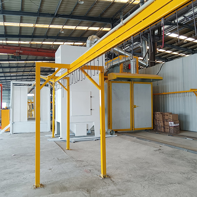 我們之前幫助客戶(hù)設(shè)計(jì)制造了一條地面輸送噴漆流水線(xiàn),由于產(chǎn)品多樣性,有些工件不適用于噴漆工藝,我們幫助客戶(hù)設(shè)計(jì)了一條噴淋前處理自動(dòng)噴涂線(xiàn),這條流水線(xiàn)的工藝流程為前處理噴淋,水分烘干,自動(dòng)噴粉,粉末烘干下件。這條線(xiàn)自動(dòng)化程度比較高,基本在上下件出設(shè)置一兩位操作工就能完成這條涂裝線(xiàn)的流水工作。這條自動(dòng)噴涂線(xiàn)前處理采用連