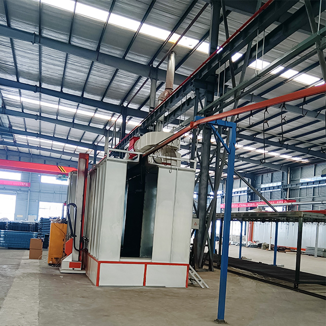 我們之前幫助客戶(hù)設(shè)計(jì)制造了一條地面輸送噴漆流水線(xiàn),由于產(chǎn)品多樣性,有些工件不適用于噴漆工藝,我們幫助客戶(hù)設(shè)計(jì)了一條噴淋前處理自動(dòng)噴涂線(xiàn),這條流水線(xiàn)的工藝流程為前處理噴淋,水分烘干,自動(dòng)噴粉,粉末烘干下件。這條線(xiàn)自動(dòng)化程度比較高,基本在上下件出設(shè)置一兩位操作工就能完成這條涂裝線(xiàn)的流水工作。這條自動(dòng)噴涂線(xiàn)前處理采用連